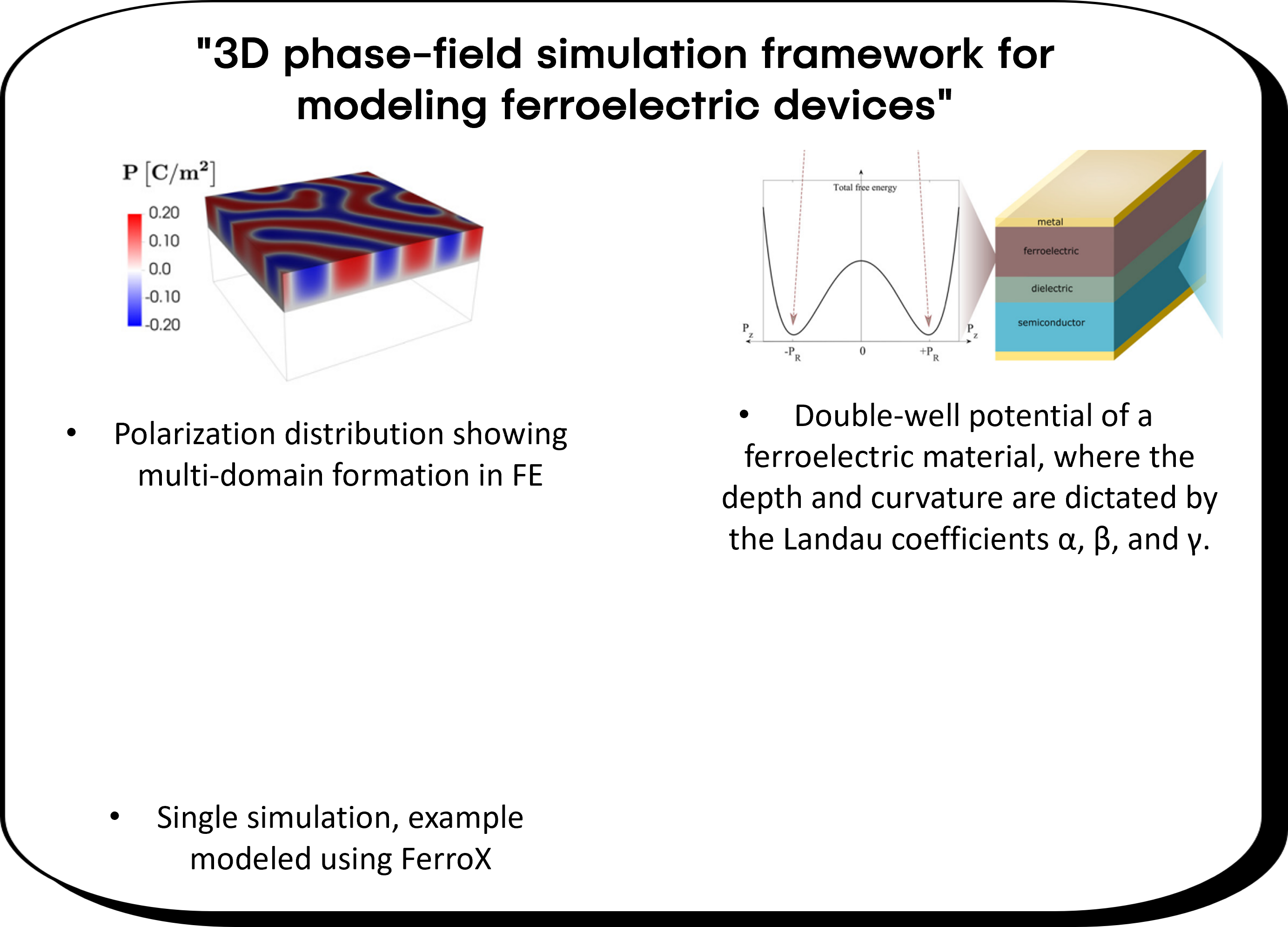 - Fernández, C. A., Muñoz, J., Zeng, Y., Kumar, P., Nonaka, A., & Yao, Z. (2024). Ferroelectricity-induced negative capacitance in microelectronic devices via phase-field simulations and machine learning. *APS March Meeting 2024.* (Oral presentation).